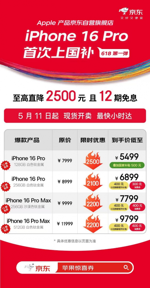 iPhone16Pro系列最佳入手时机来啦!5月11日起,iPhone16Pro系列京东直降2000元,其中原价7999元的128G版本iPhone16Pro降价后到手价5999元。这也意味着iPhone16Pro将首次进入“国补”范畴。京东下单享“国补”立减500元后,iPhone16Pro128GB版本到手价低至5499元,还享12期免息,创下该机型上市以来的历史新低。更值得一提的是,京东现货开卖,新机不用等,最快小时达。打开京东APP,搜索“苹果惊喜券”,一键直达活动页面。